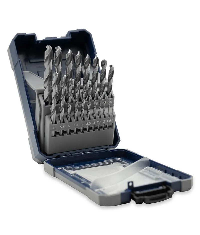 Los Juegos de mechas de Acero Rápido rectificado (HSS 4341) para uso profesional, cuentan con filos destalonados y puntas Split Point en todas las medidas, para mayor precisión y velocidad de corte.