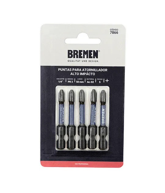 Las puntas de atornillador de alto impacto BREMEN esta diseñadas en material S2 lo que le otorga mayor resistencia y durabilidad
